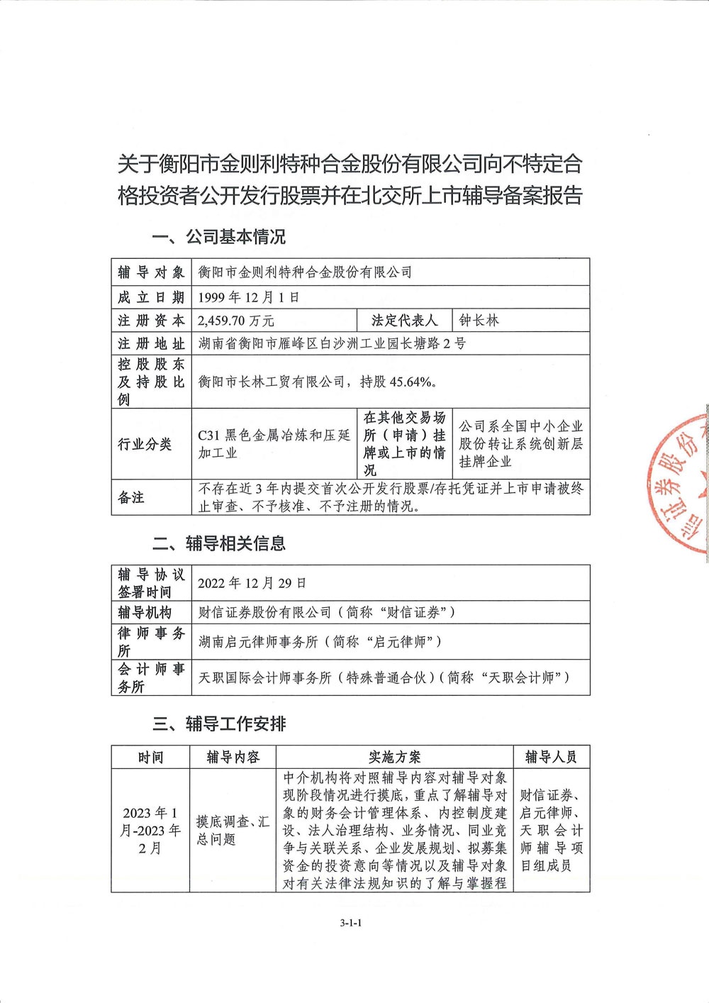 • 關于衡陽市金則利特種合金股份有限公司首次公開發(fā)行股票并上市輔導備案報告